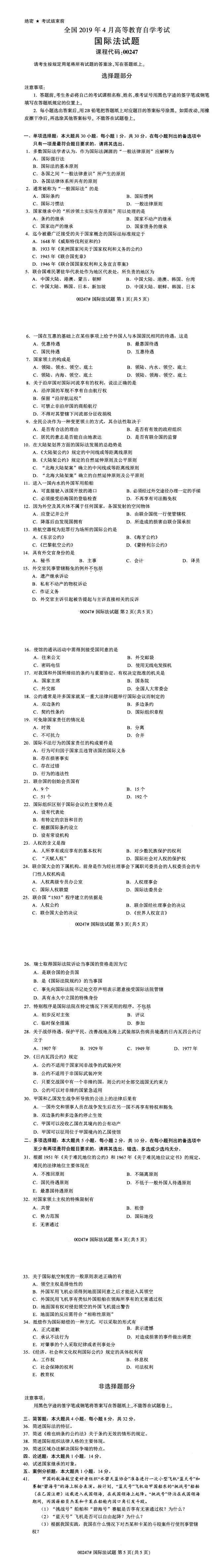 全國(guó)2019年4月自考00247國(guó)際法試題