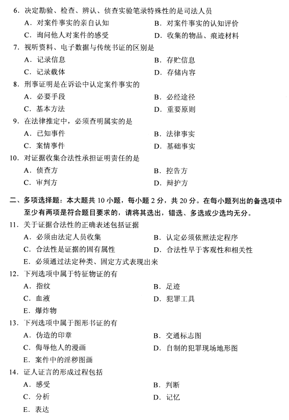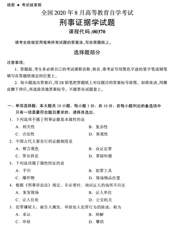 2020年8月全國自考刑事證據(jù)學(xué)00370試卷