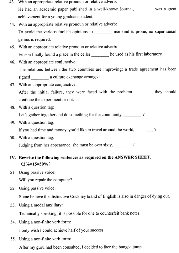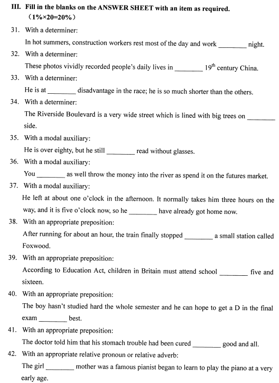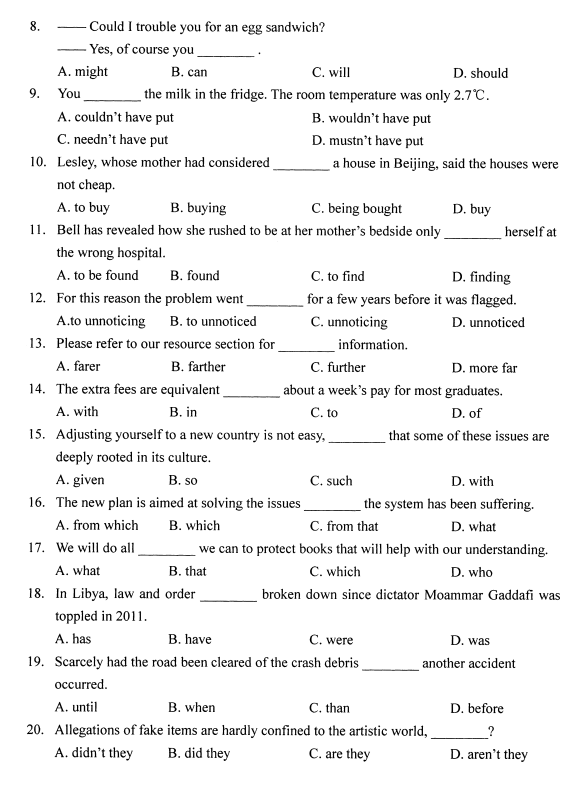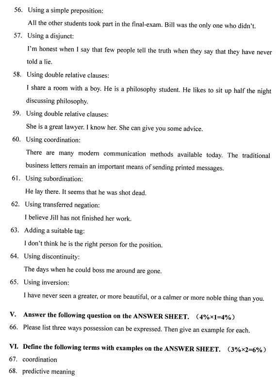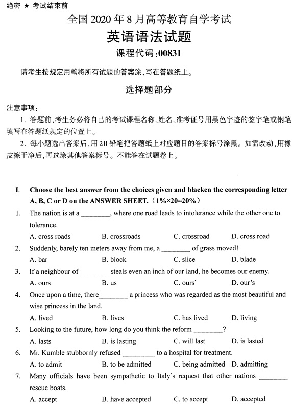 2020年8月全國自考英語語法00831試題