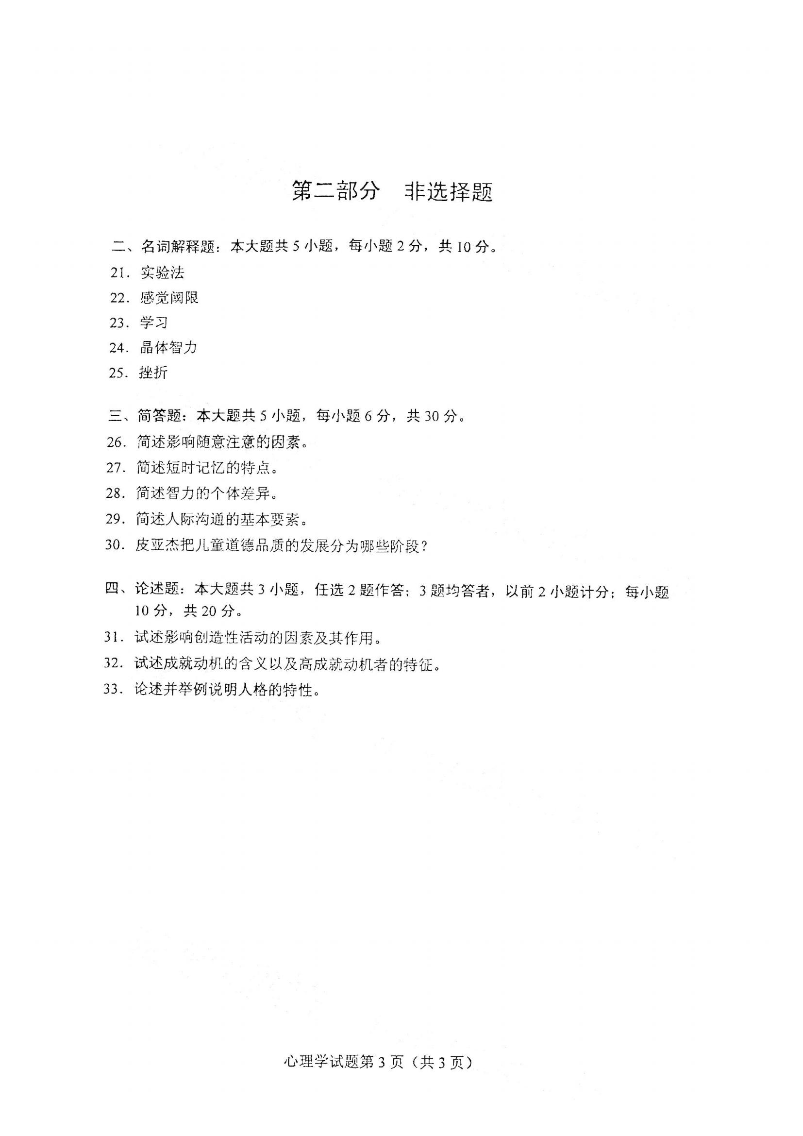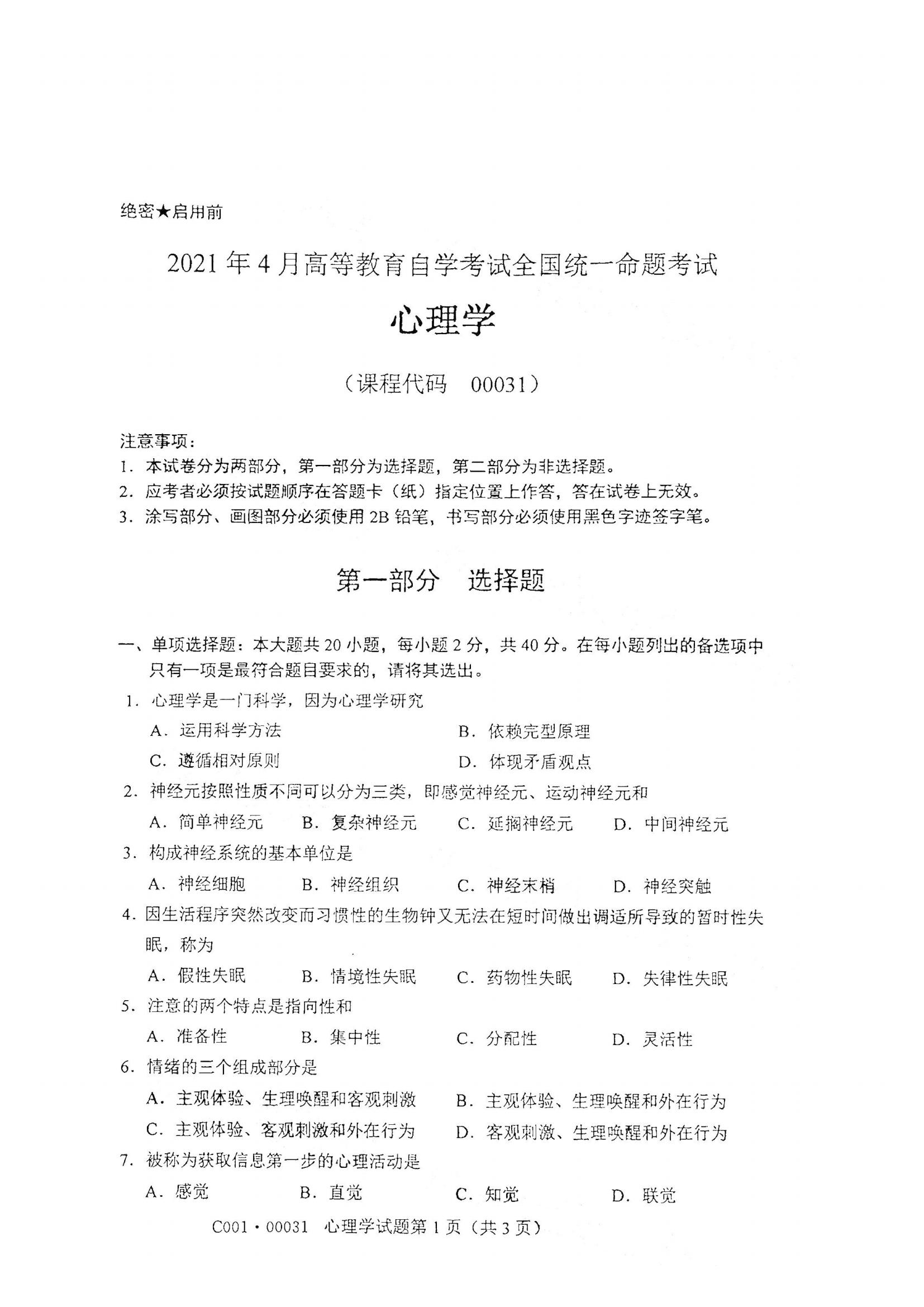 2021年4月江西自考00031心理學(xué)真題試卷
