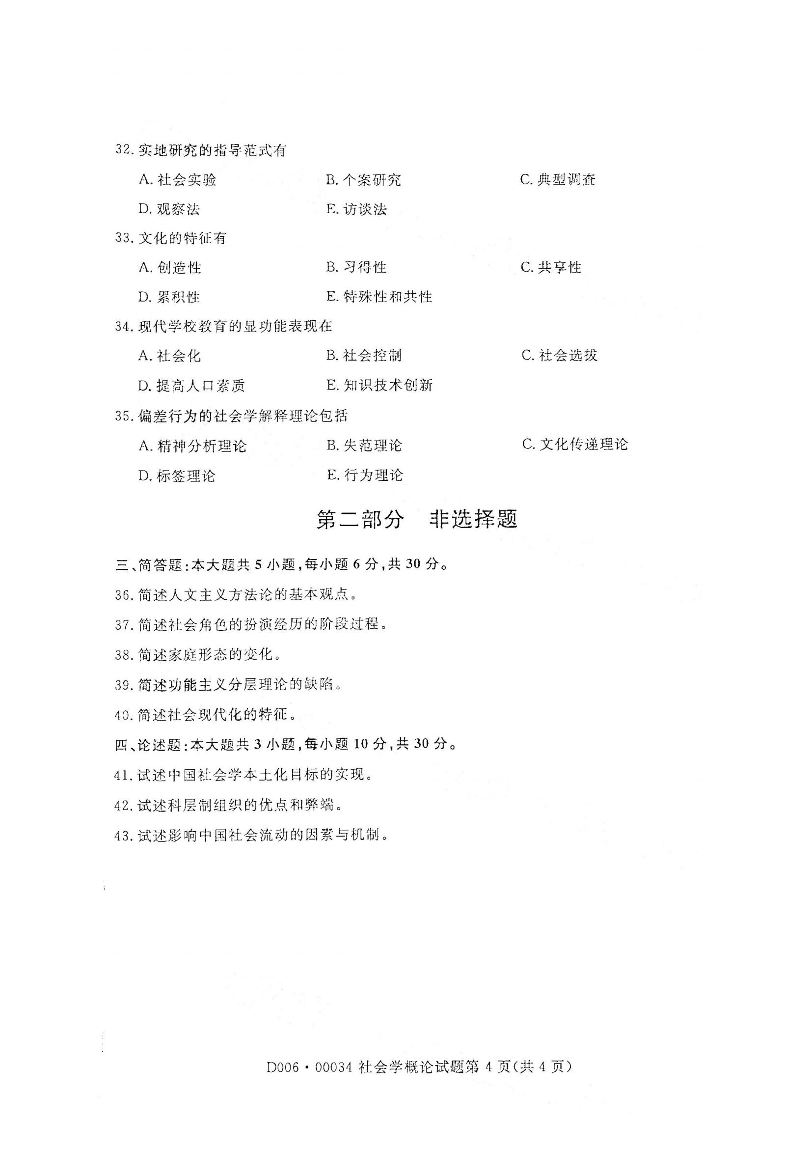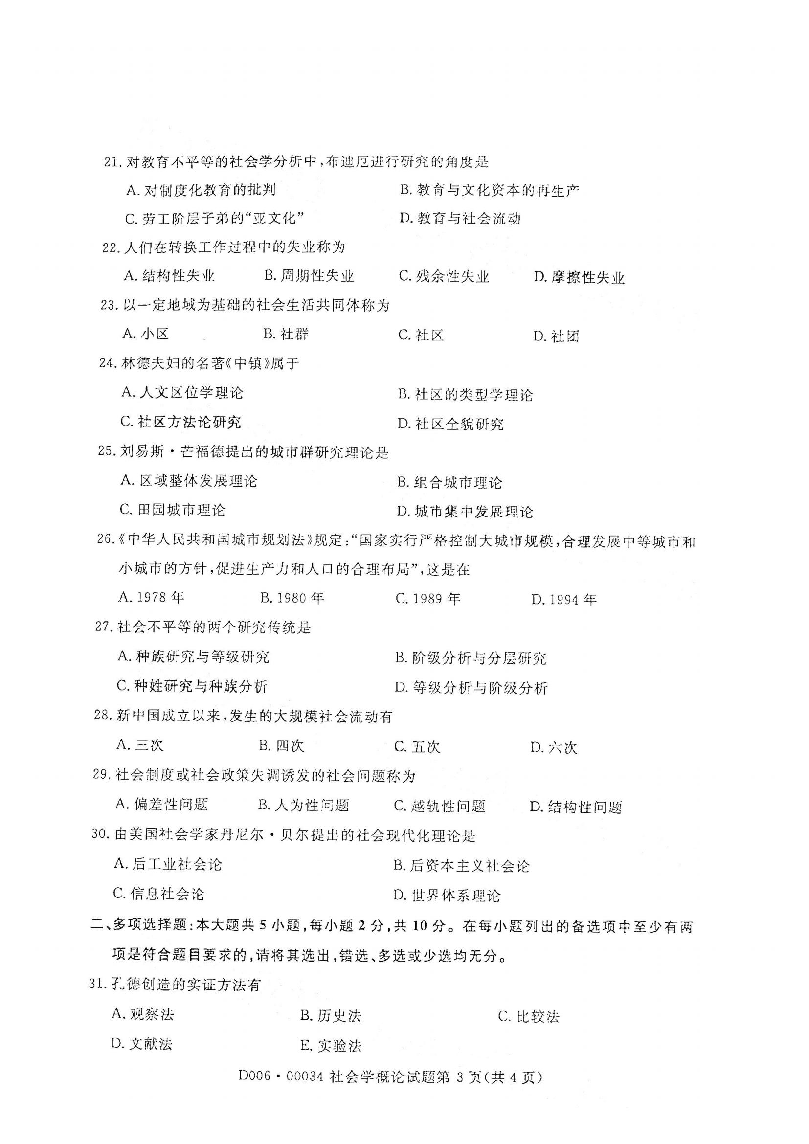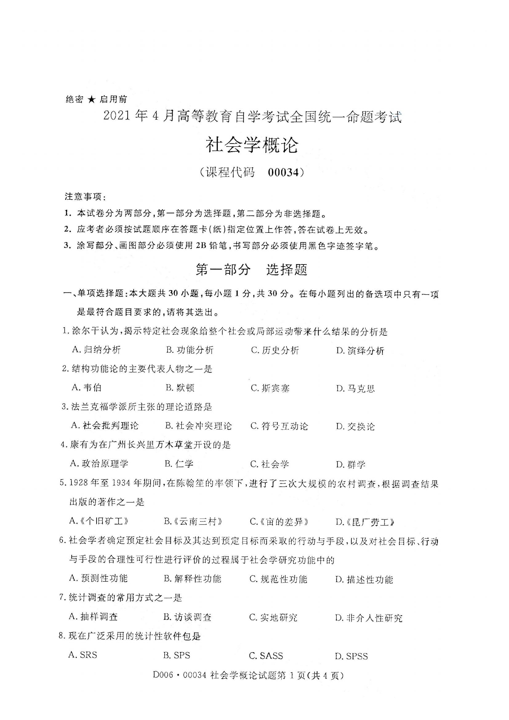 2021年4月江西自考00034社會(huì)學(xué)概論真題試卷